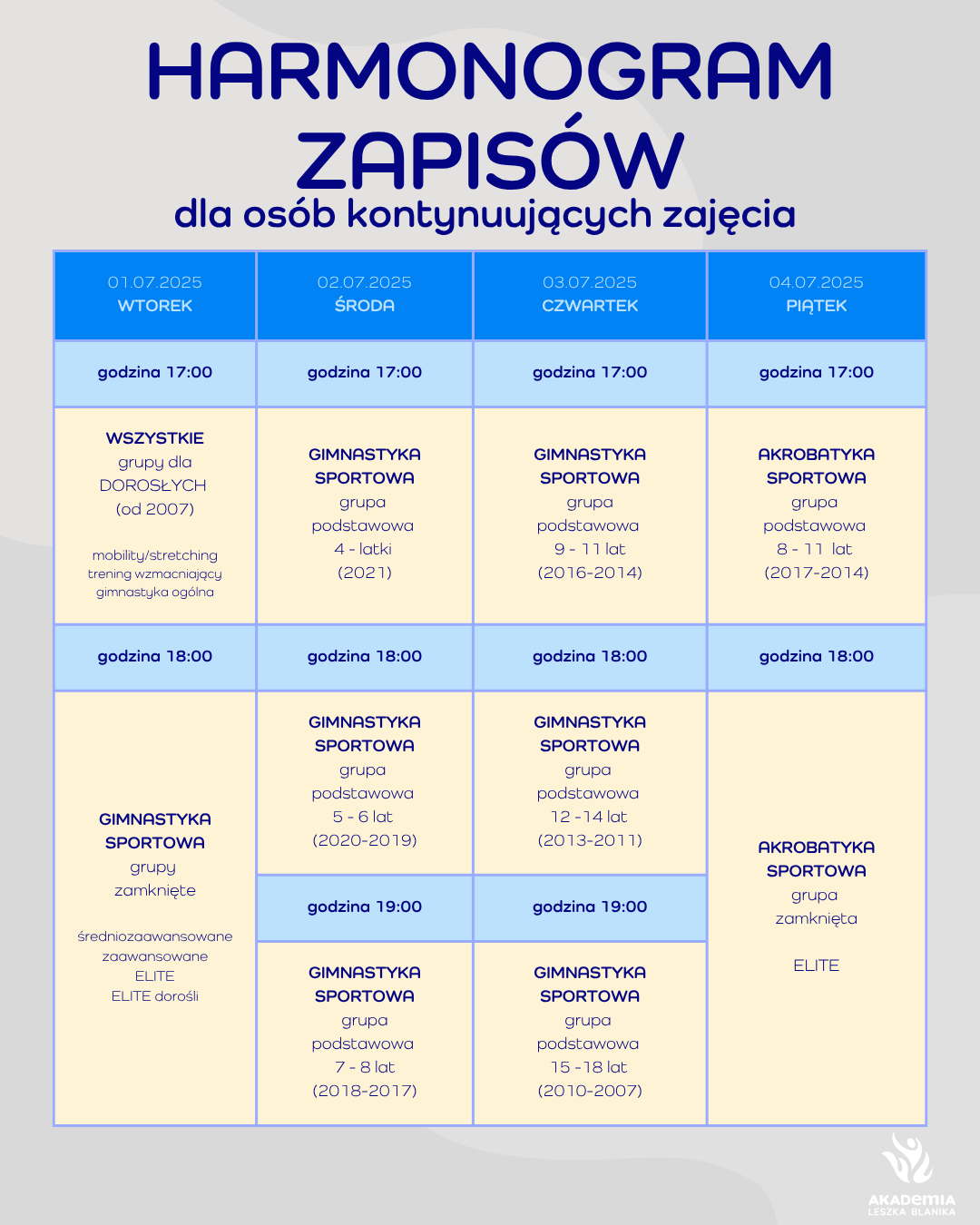z wyznaczonymi dniami i godzinami rekrutacji na kolejny sezon. Zespół Akademii
