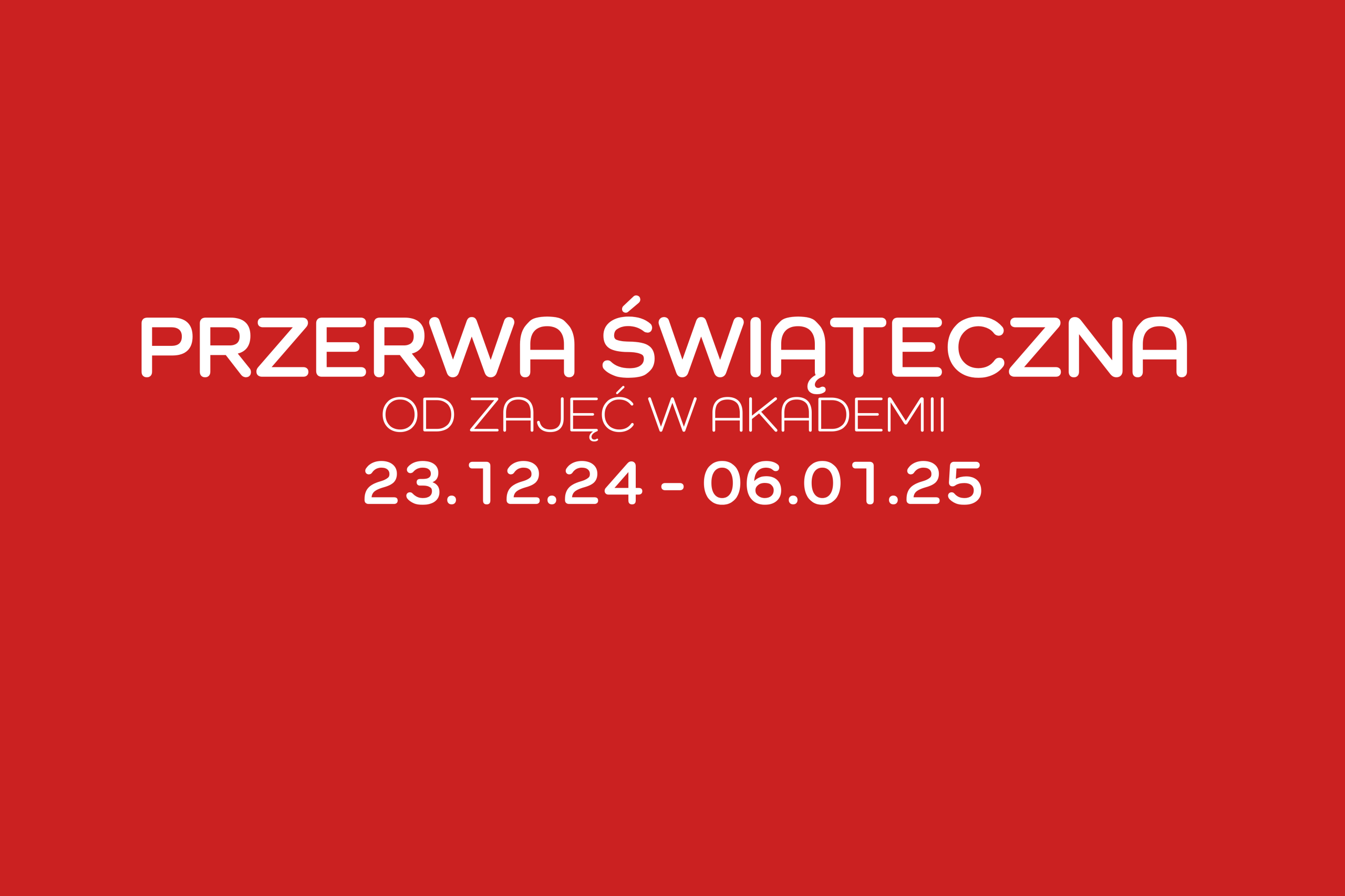 chcielibyśmy serdecznie przypomnieć iż od dnia 23.12.2024 do 06.01.2025 (włącznie) zajęcia grupowe w Akademii nie będą się odbywać.